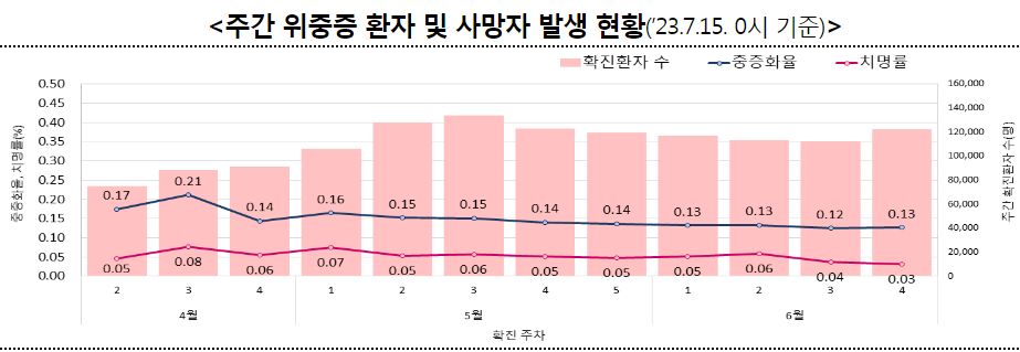 ㅡ 최근 확진자 발생은 3주 연속 증가하고 있으나 ’23.6월 4주차 중증화율, 치명률은 각각 0.13%, 0.03%