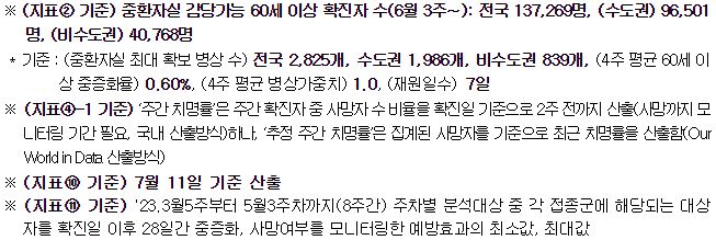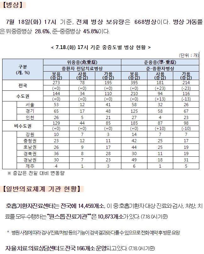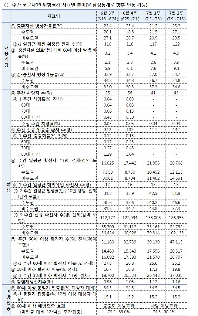 * 중환자 병상가동률(7.1주 → 7.2주): (전국) 21.2% → 28.2%, (수도권) 21.5% → 27.1%, (비수도권) 20.9% → 29.5%