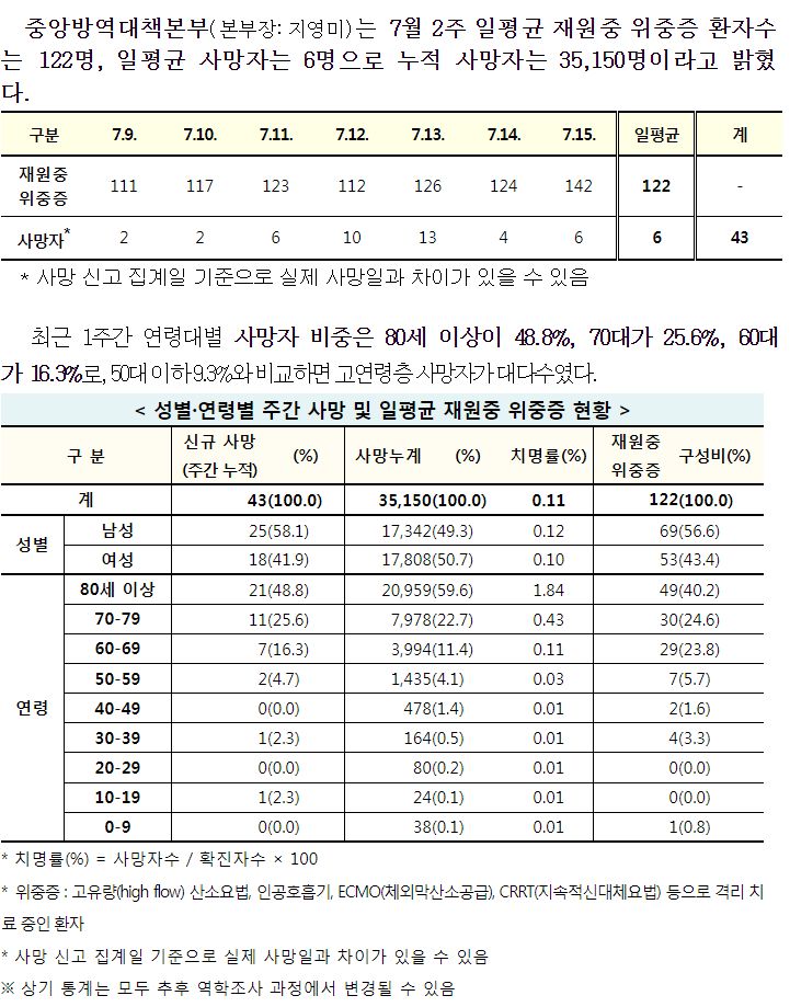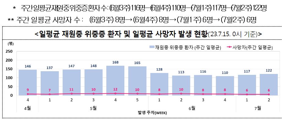 ㅡ 지난주 재원중 위중증 환자수는 전주 대비 4.3% 증가하여 일평균 122명이고, 신규 사망자 수는 전주 대비 4.9% 증가(41명→43명)하였고 일평균은 6명