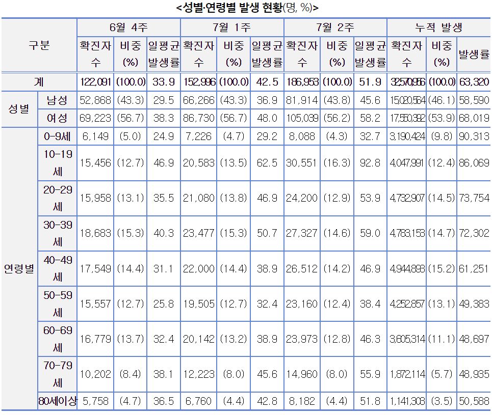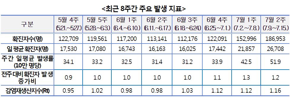 7월 2주(7.9.~7.15.) 주간 신규 확진자는 186,953명으로 전주 대비 22.2% 증가하였다. 주간 일평균 확진자수는 26,708명이고, 감염재생산지수는 1.16이며, 최근 3주 연속 1이상으로 증가. 모든 연령대에서 발생자 증가.