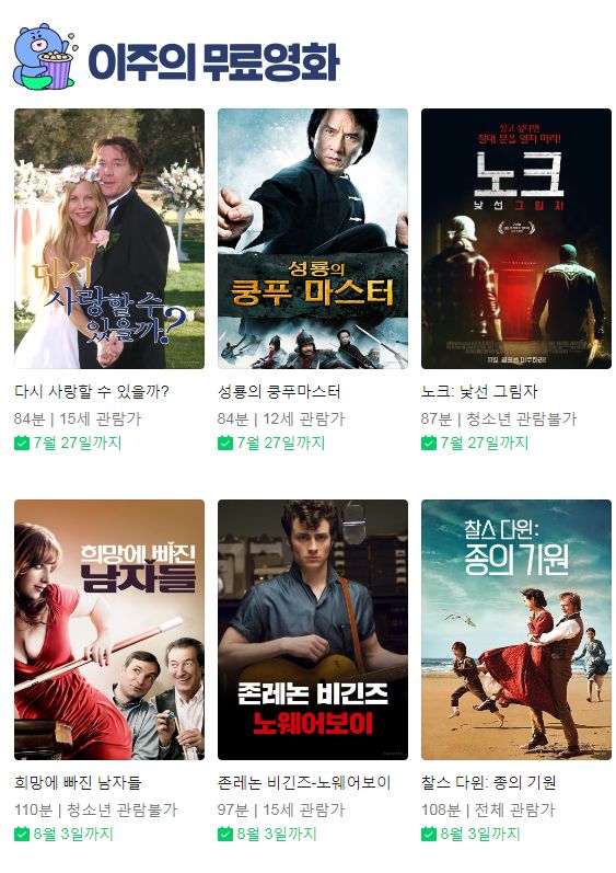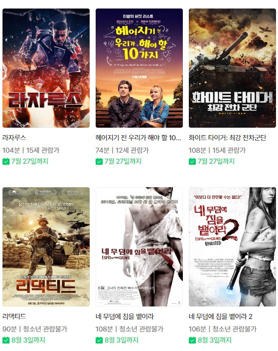 ~7.27까지.. 다시 사랑할 수 있을까, 성룡의 쿵푸마스터, 노크:낯선 그림자, 라자루스, 헤어지기 전에 우리가 해야 할 일 10가지, 화이트 타이거:최강 전차군단