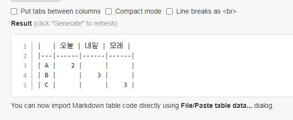 위 예시표의, latex, text, markdown, mediawiki 표 양식출력은 각각 이렇습니다.