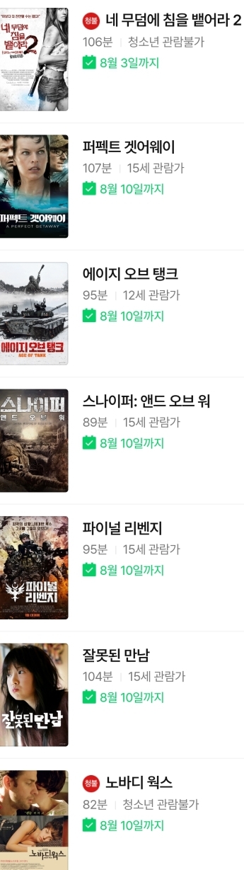 | (네이버시리즈온 무료영화) 에이지 오브 탱크, 파이널 리벤지, 스나이퍼:엔드 오브 워, 분노의 전차군단, 네이비씰, 알래스카 대지진 (0) | 2023.08.04 |