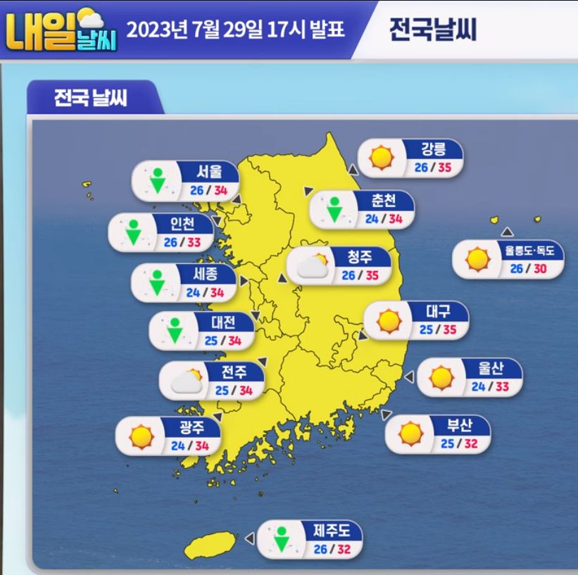 2023.7.30.일. 서울, 대전 날씨: 열대야+폭염+ 곳에 따라 소나기 본문