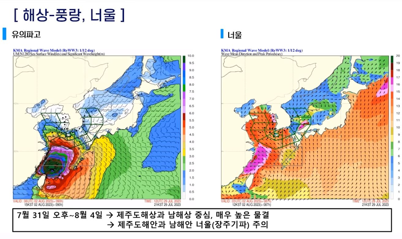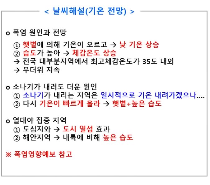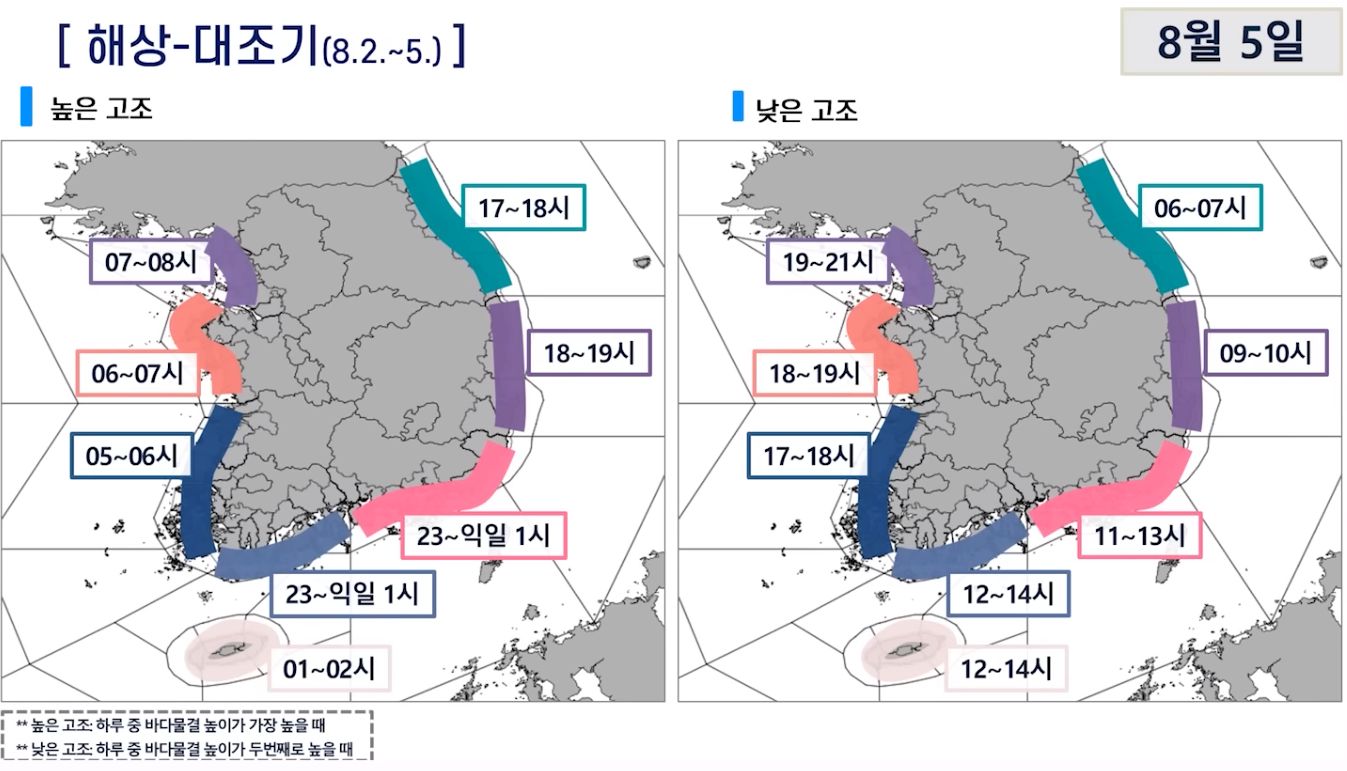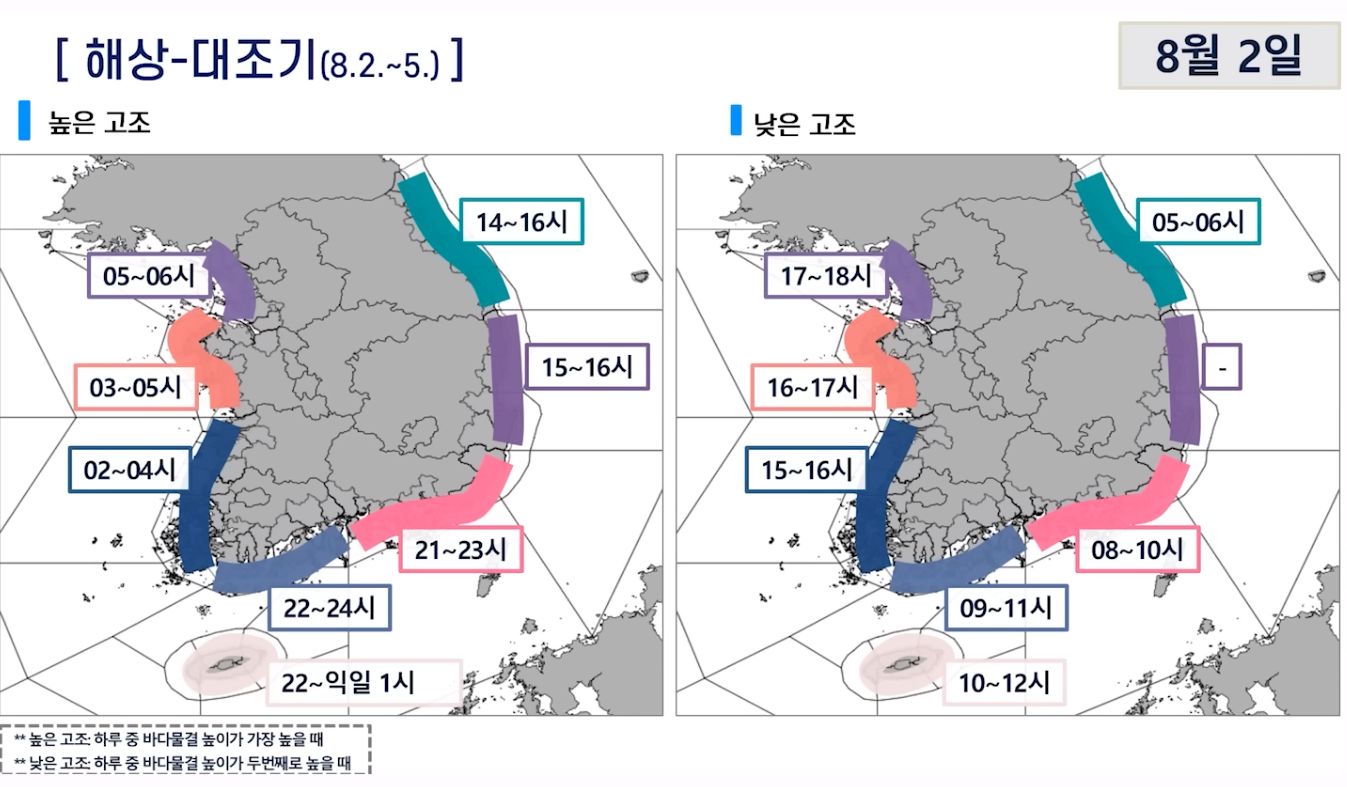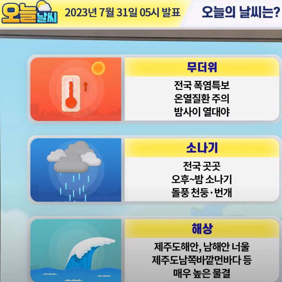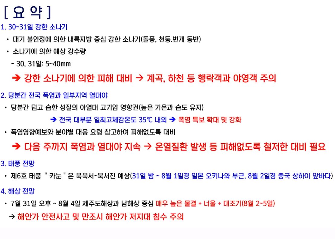 요약: 소나기, 폭얌+열대야, 7월 31일 오후부터 8월 4일까지 높은 물결과 너울로 안전사고 주의 + 대조기(8.2~5)로 해안가 저지대 침수 주의.