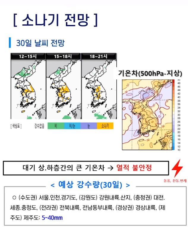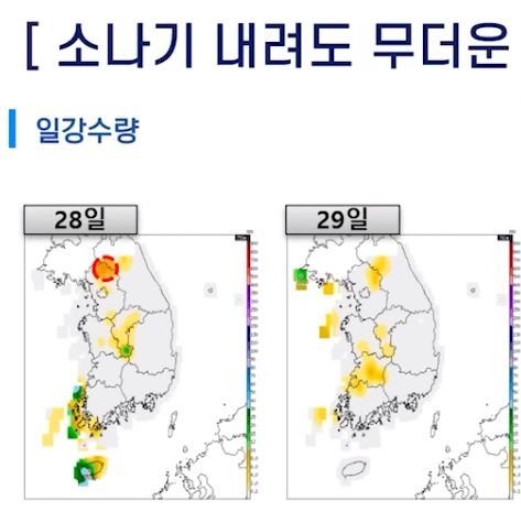 소나기는 주로 오후와 저녁. 강수량은 대부분 지역에서는 호우까지는 아니나 일부지역은 주의.