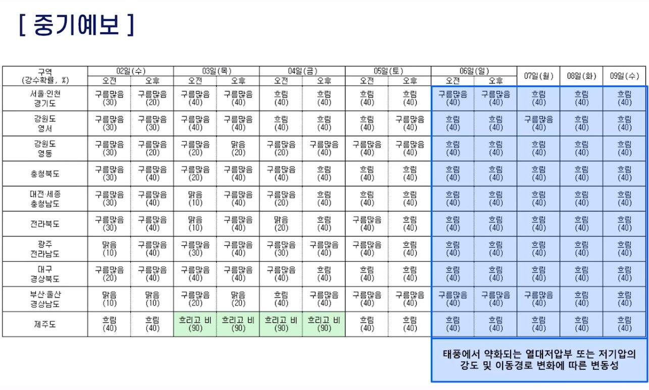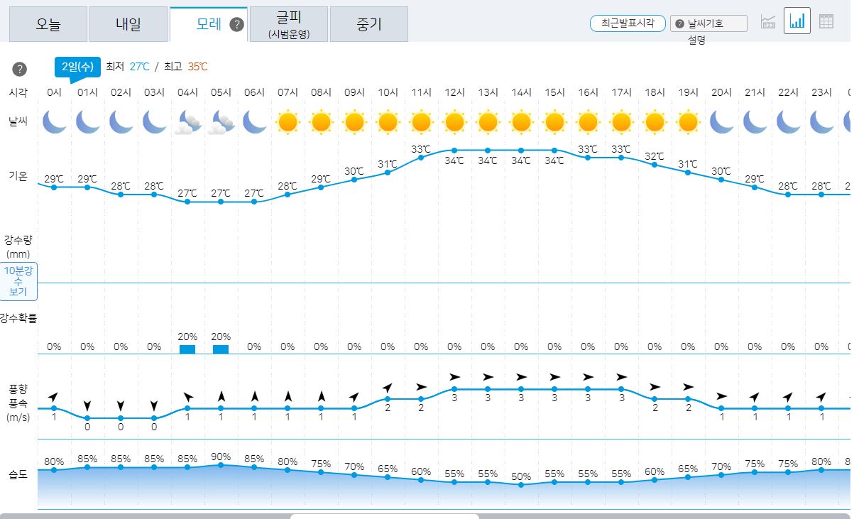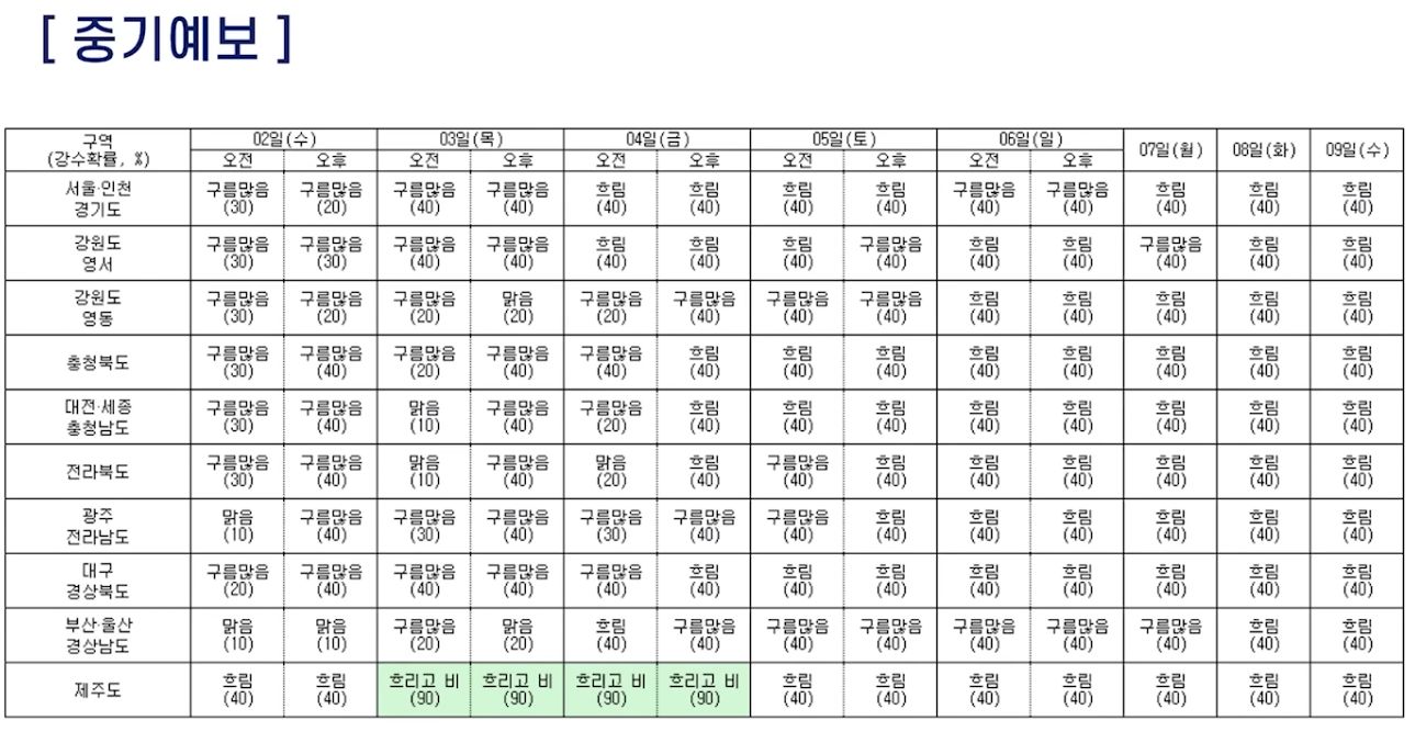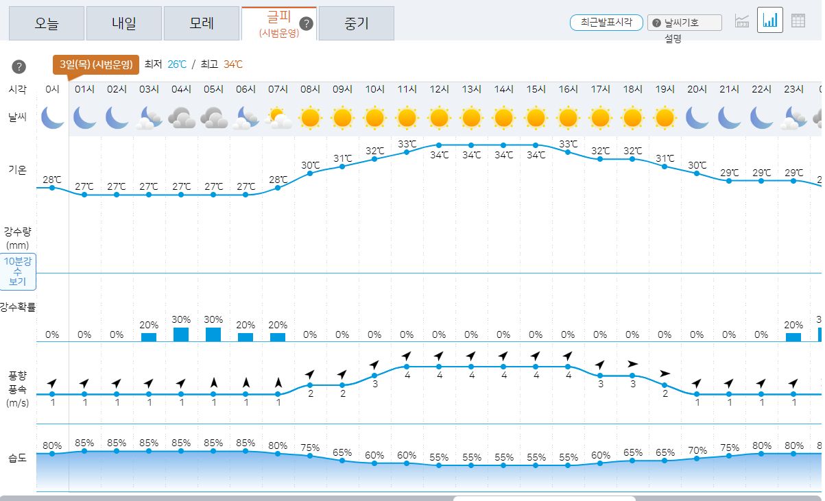 중기예보: 비 예보는 없지만, 대기불안정으로 그날 그날의 단기예보를 볼 것. 소나기가 들어갈 수 있다.