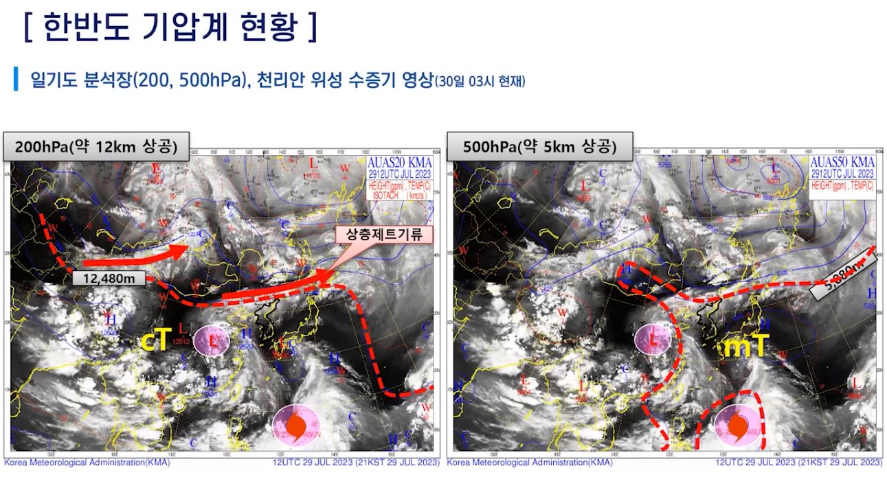 태풍이 북태평양고기압에 눌리는 모양새, 그리고 같은 고기압의 가장자리에서 한국은 소나기 잦아