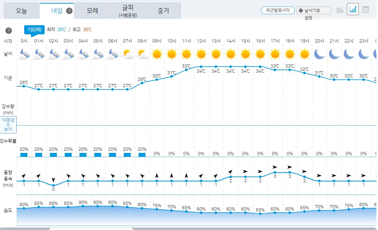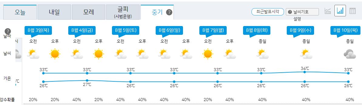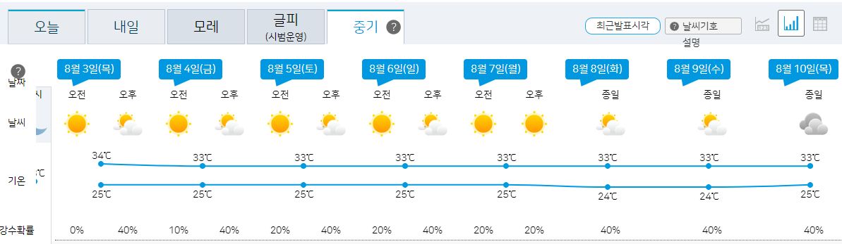 2023.7.31.월.~8.10.목 서울,대전 날씨/일기예보: 소나기, 폭염+열대야 본문