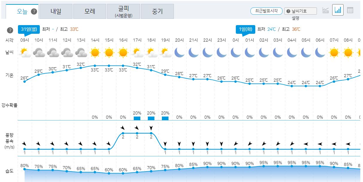 [오늘날씨] 온열질환 주의! 오후 소나기 곳. 7월 31일 5시 기준