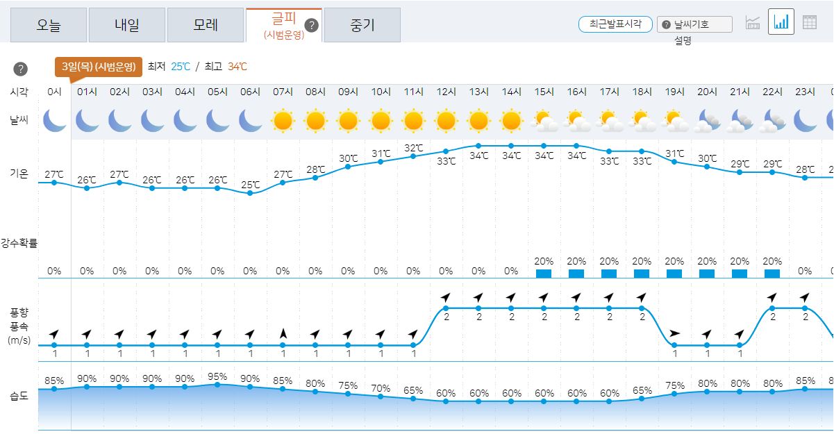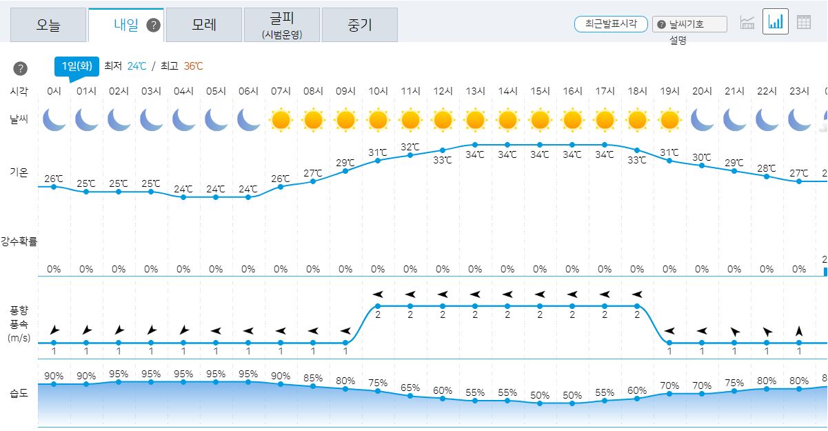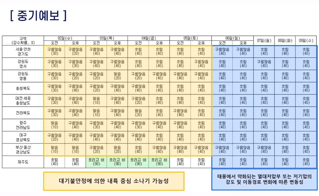 중기예보: 비 예보는 없지만, 대기불안정으로 그날 그날의 단기예보를 볼 것. 소나기가 들어갈 수 있다.