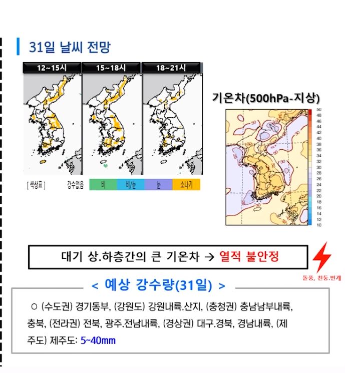 대기 상하층의 기온차가 커 열적 불안정. => 뇌우