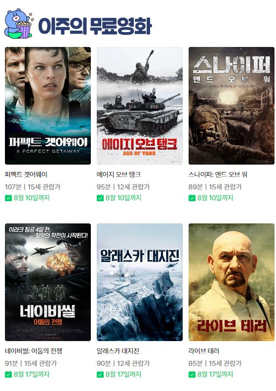 | (네이버시리즈온 무료영화) 에이지 오브 탱크, 노바디 웍스, 잘못된 만남, 퍼펙트 겟어웨이 등 (0) | 2023.07.28 |