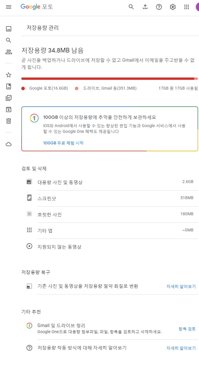 나중에 다시 들어가보면 용량이 늘어나있습니다. 스마트폰의 구글포토앱을 봐도 됩니다.