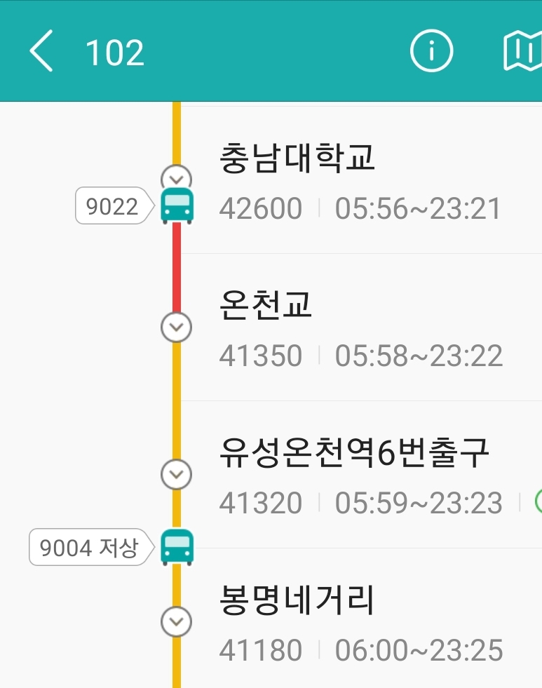 2. 각 정거장의 첫차와 막차 시간을 대략적으로 표시해줍니다. 요즘은 대전도 시내는 이 정도까지는 버스가 다닙니다. 모든 구간은 아니지만 많이 좋아진 것.