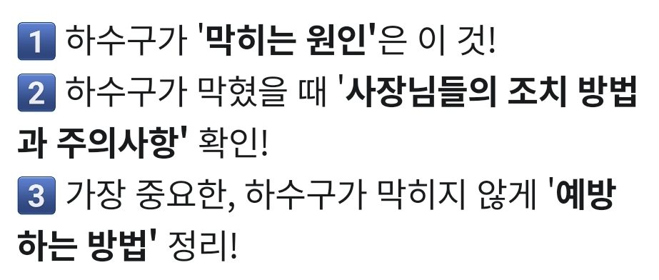 하수도 막힘의 원인은 대부분 조리 전, 후 발생한 음식물과 기름이 원인입니다. (.....) 이물질의 종류, 배관 성분에 맞춰서 올바른 제품을 사용하시는 것이 배관 파손늘 막고 더욱 효과적으로 청소 가능 (락스의 경우 살균소독에 용도가 있으며 배관을 뚫어주는 용도가 아닙니다) - 배민외식업광장