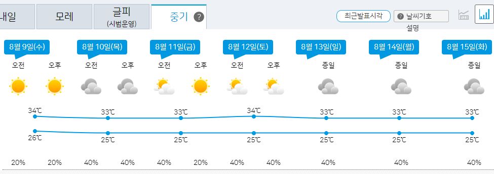 2023.8.6.일. ~8.15.화. 서울, 대전 일기예보: 폭염+열대야+소나기. 주 중반부터 태풍영향있음 본문