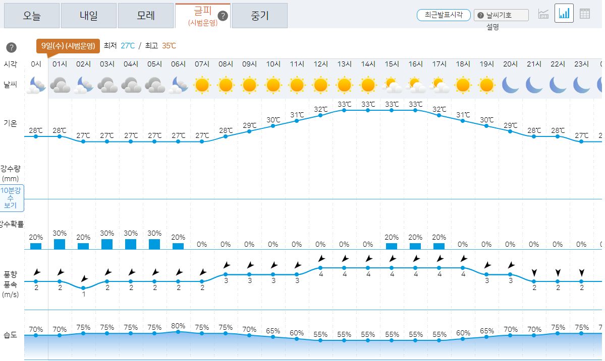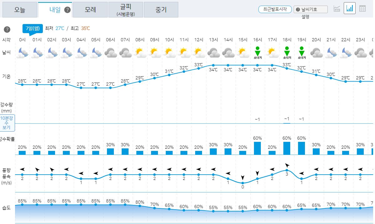 고온다습한 폭염, 열대야. 그리고 우리나라 여름날씨특징 + 태풍이 대기를 흔들어 생기는 변동성으로, 중기예보에는 없어도 당일예보나 갑자기 소나기가 있을 수 있습니다. 일요일인 오늘도 소나기 있습니다.