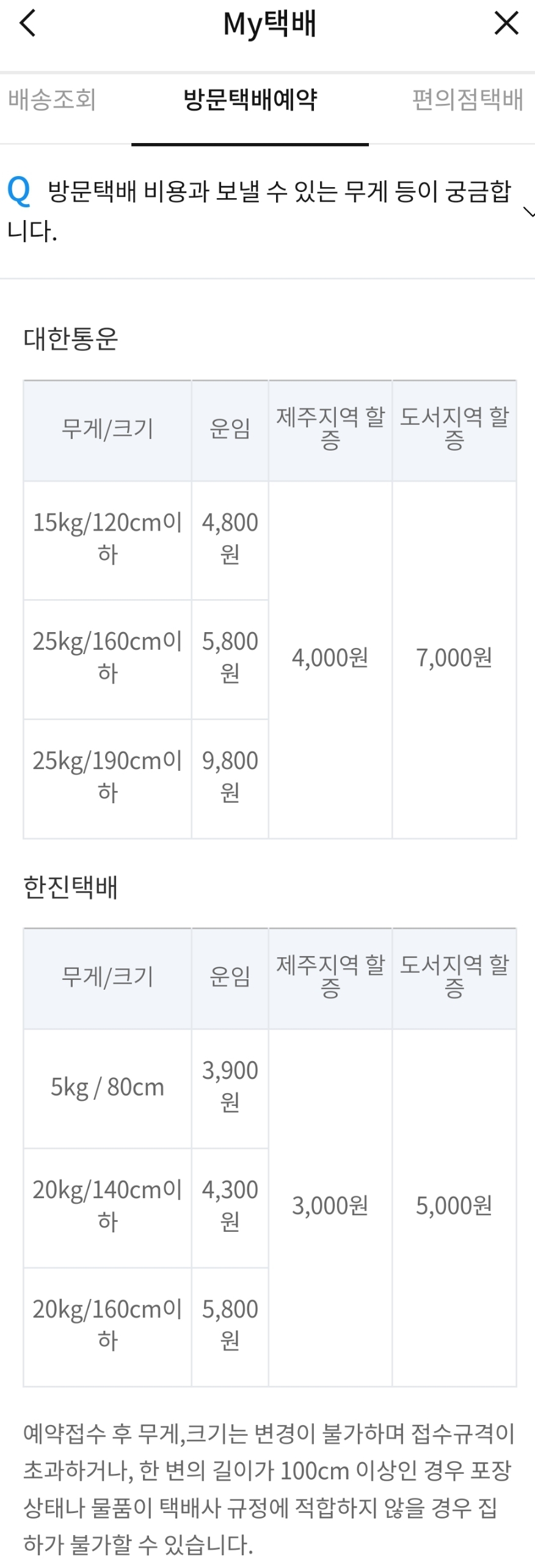 방문택배는 CJ대한통운, 한진택배고