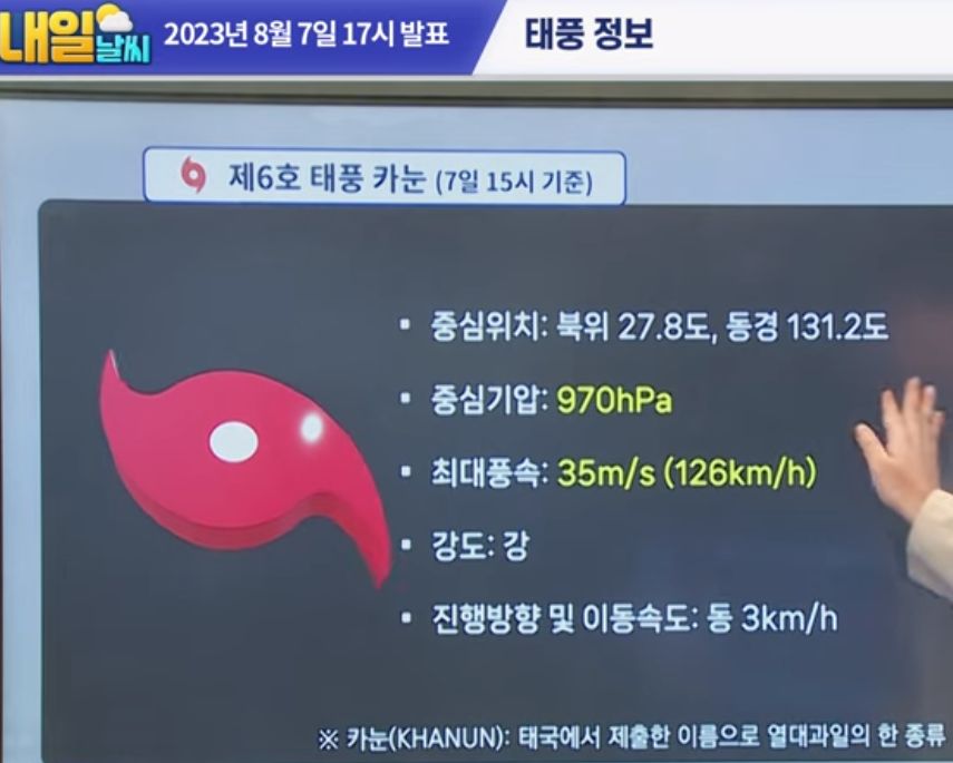 | 제6호태풍 카눈의 진로. 2023.8.6.오후 기상청 유튜브, 8.7. 04시 통보문: 한반도를 관통해 북진 (0) | 2023.08.06 |