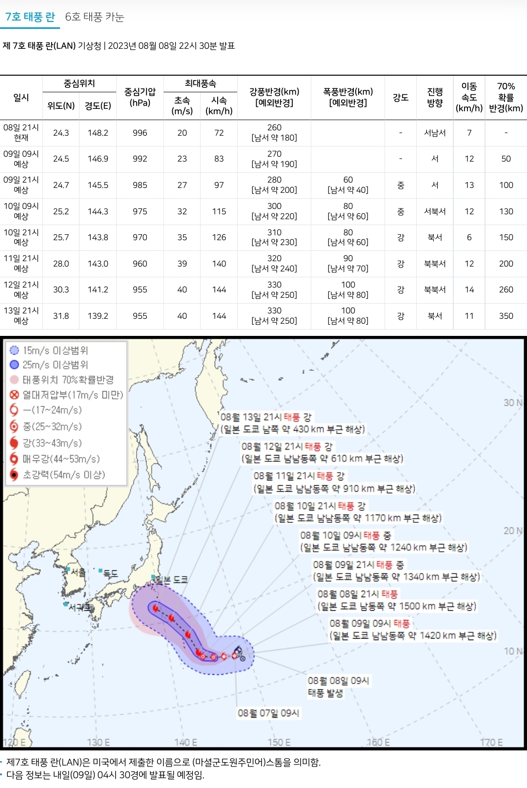 제 7호 태풍 란(LAN) 기상청 | 2023년 08월 08일 22시 30분 발표
