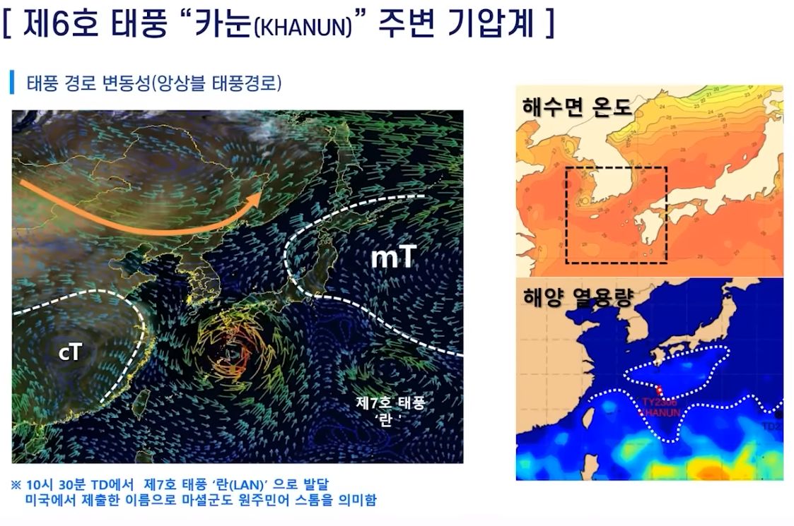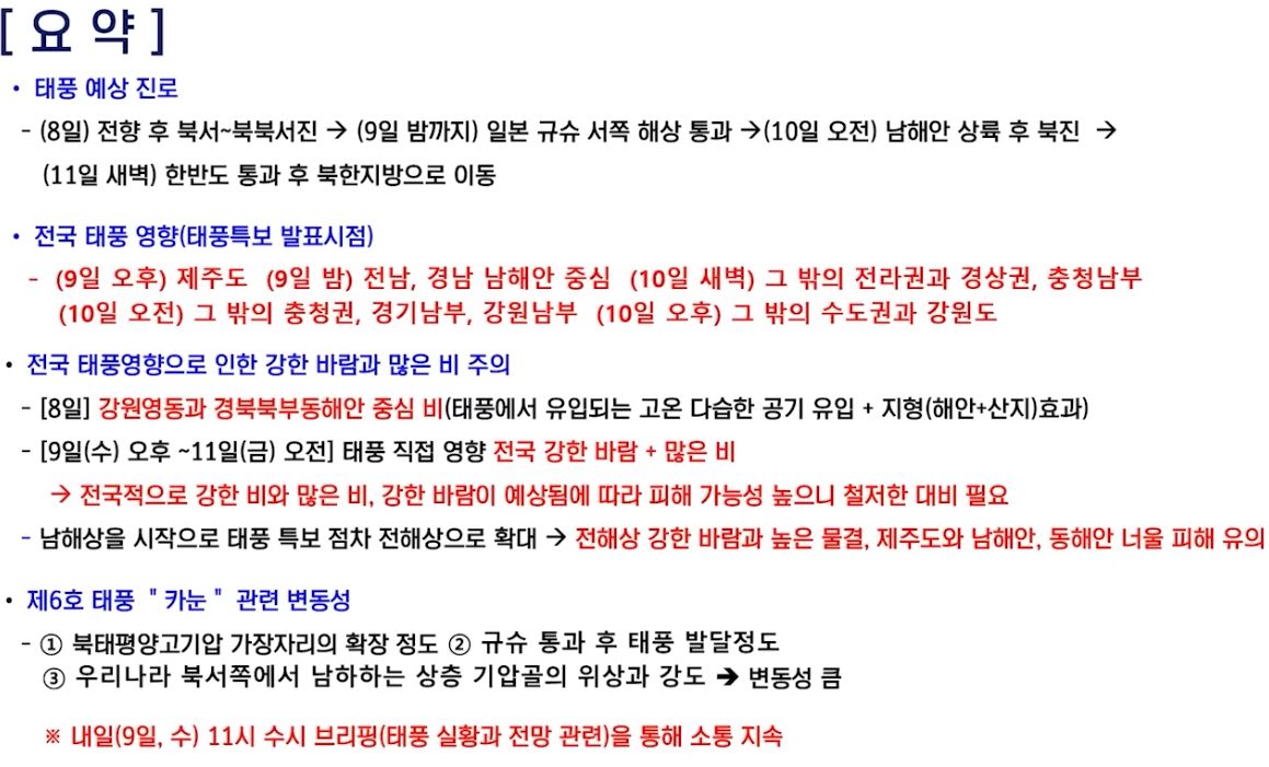 [기상청 브리핑. 8.8. 17시. ] 제6호 태풍 카눈 비상구역 진입. 10일 남해안 상륙 후 전국 영향권. 제7호 태풍 란 발생.