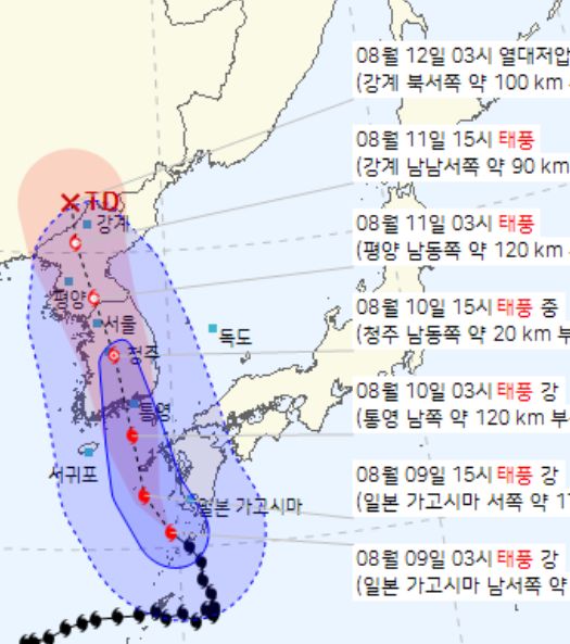 [내일날씨] 전국 태풍 영향권, 강한 비바람 주의! 8월 8일 17시 기준