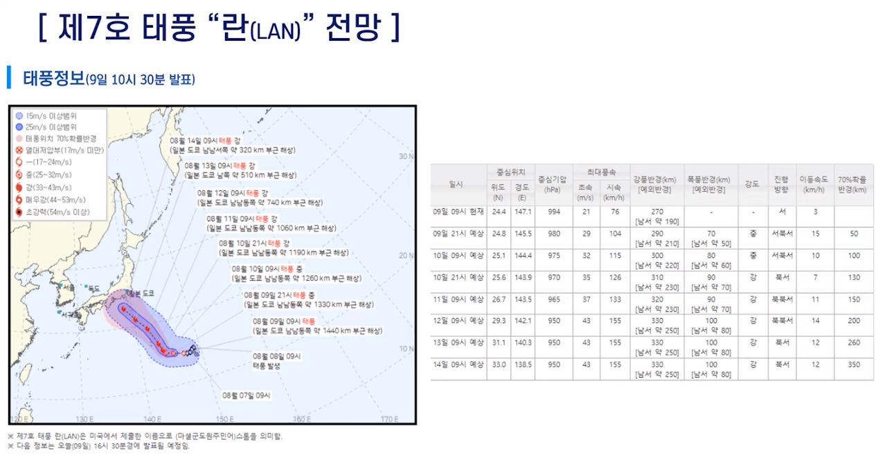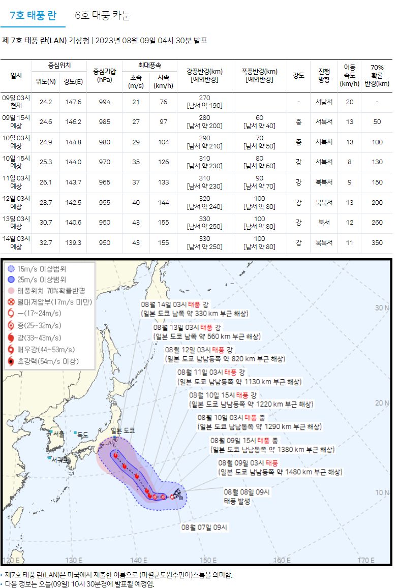 제 7호 태풍 란(LAN) 기상청 | 2023년 08월 09일 16시 30분 발표