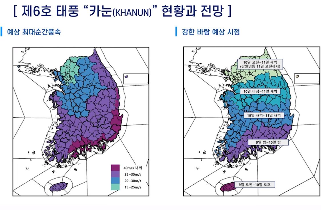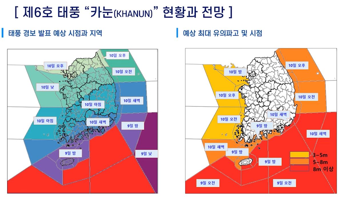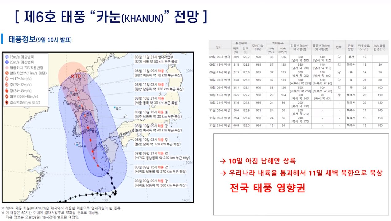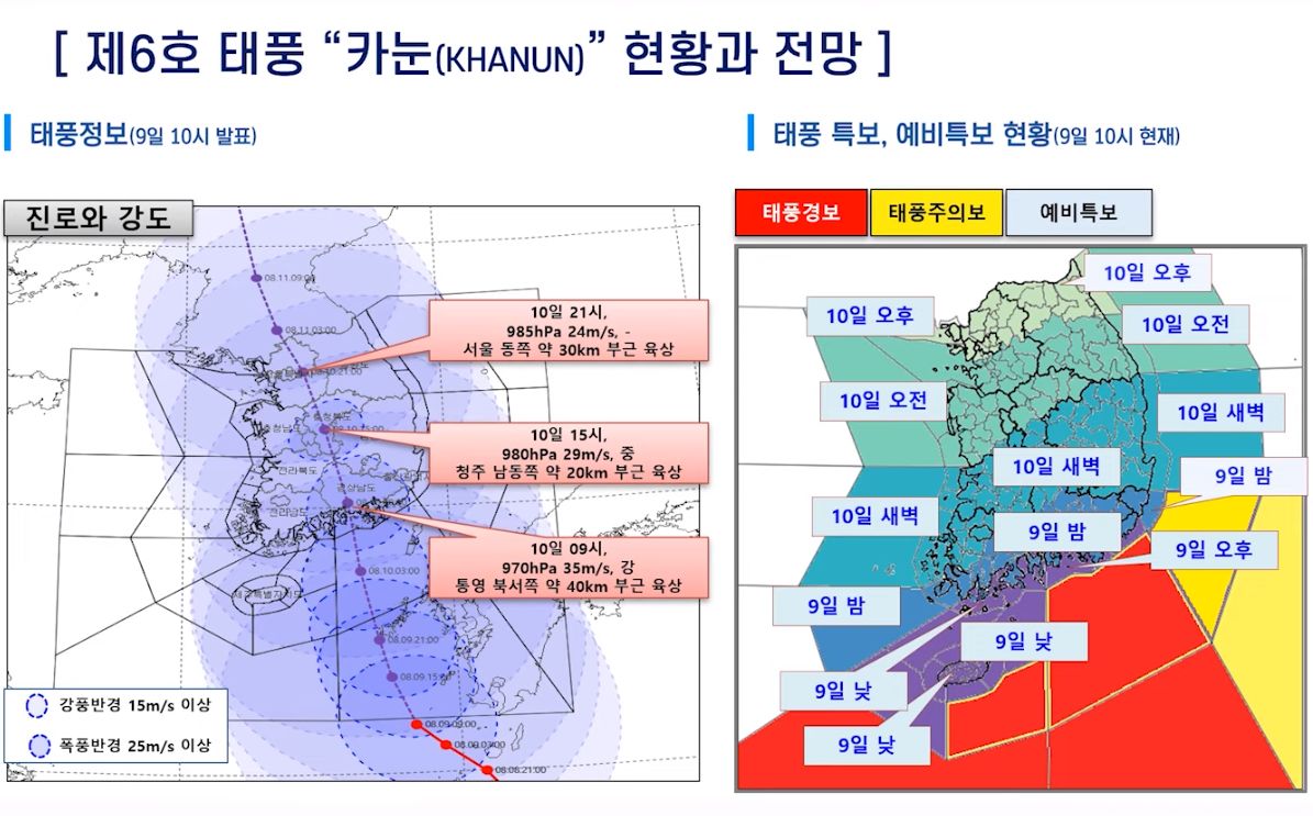 [기상청 브리핑] 9일 11시, 제주도와 제주도해상 등 태풍 특보 발효! 밤부터 점차 확대. 지역별 태풍 영향 시점 확인 필요.