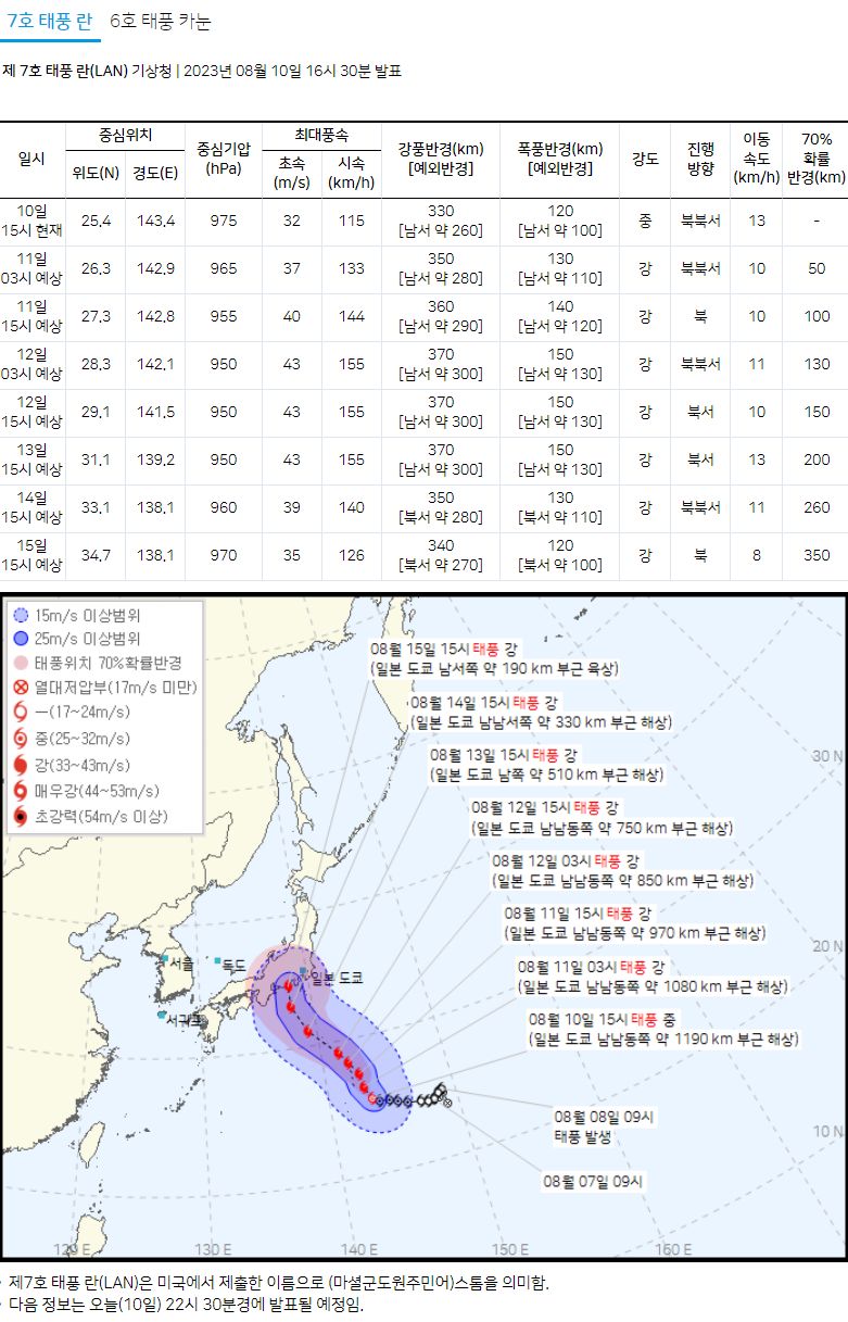 제 7호 태풍 란(LAN) 기상청 | 2023년 08월 10일 16시 30분 발표