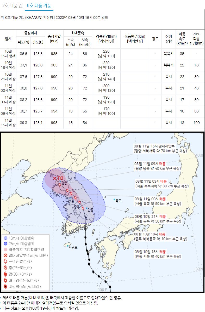 ★★태풍 일기예보(2023.8.10.기상청): 태풍 카눈의 중심은 우리나라 충북지방을 통과 중 본문