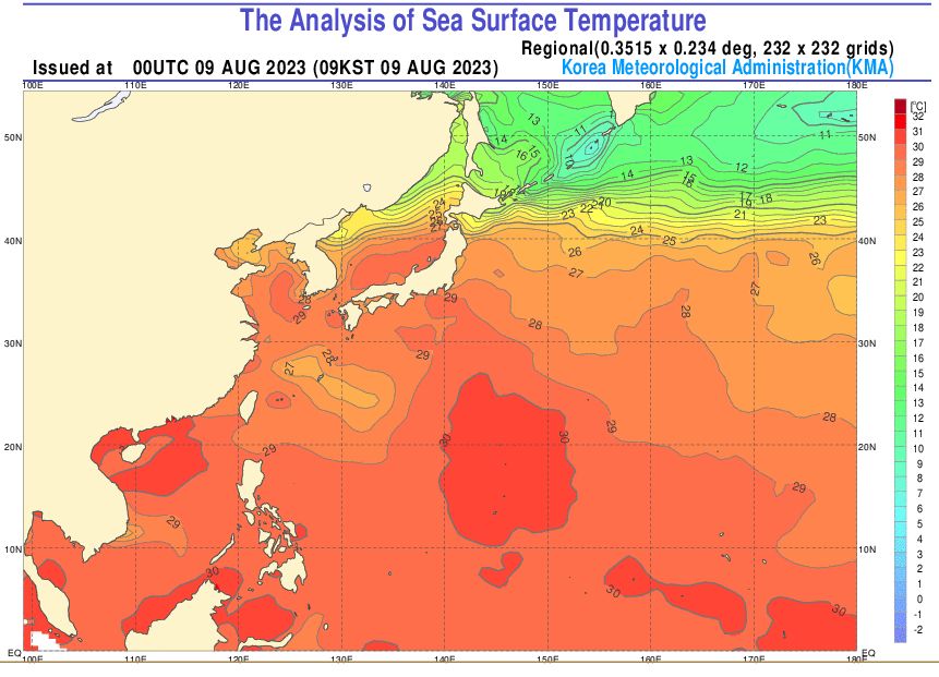 해수면온도지도. 붉은색일수록 태풍에 에너지를 공급한다는 뜻입니다. 대략 29~30도 정도면 그렇고, 그 밑으로 갈수록 태풍이 그 해역을 지나가며 에너지를 빼앗긴다는 듯. 이것이 올해는 좀 올랐다고.