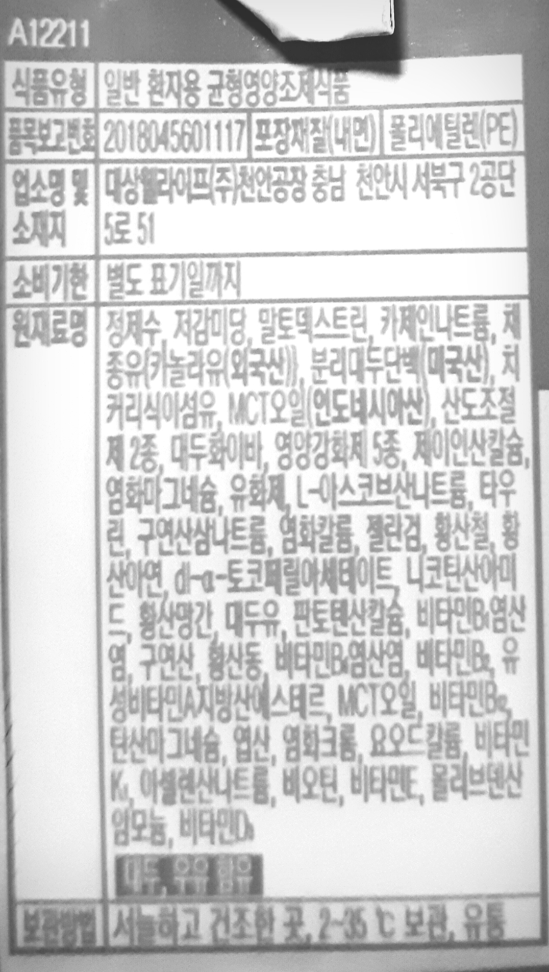 열량입니다. 여기서부터는 읽기 쉽게, 사진을 흑백으로 처리했습니다.
