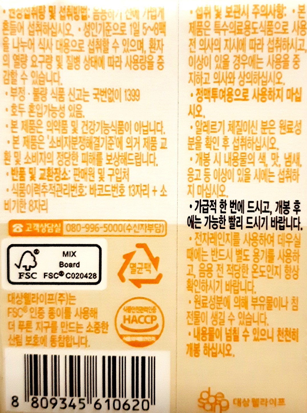 경관급식용이면서 고칼로리기 때문에, 기호성(맛)같은 요소보다는 영양공급에 초점을 마췄다고 보면 되겠네요. 1
