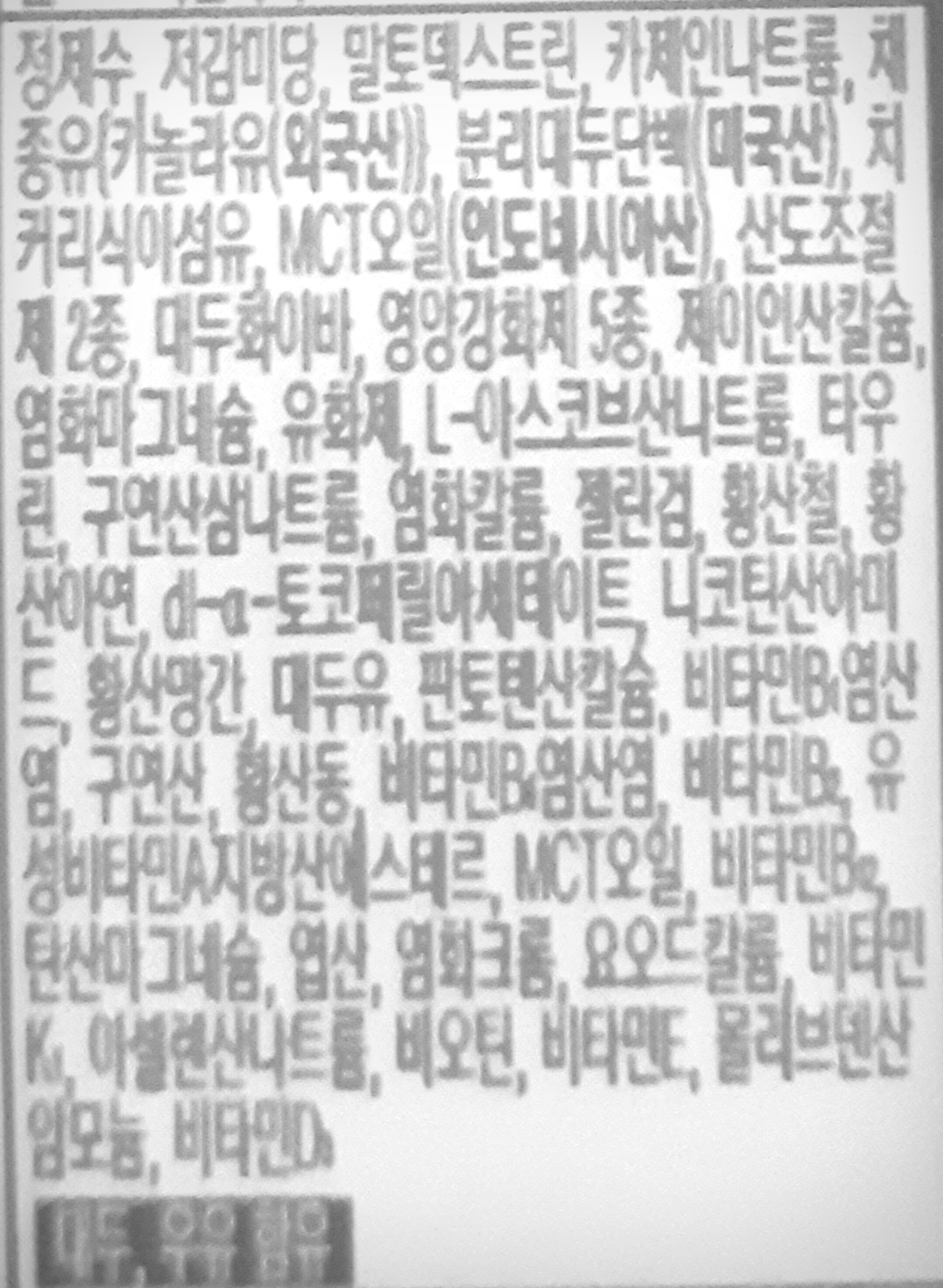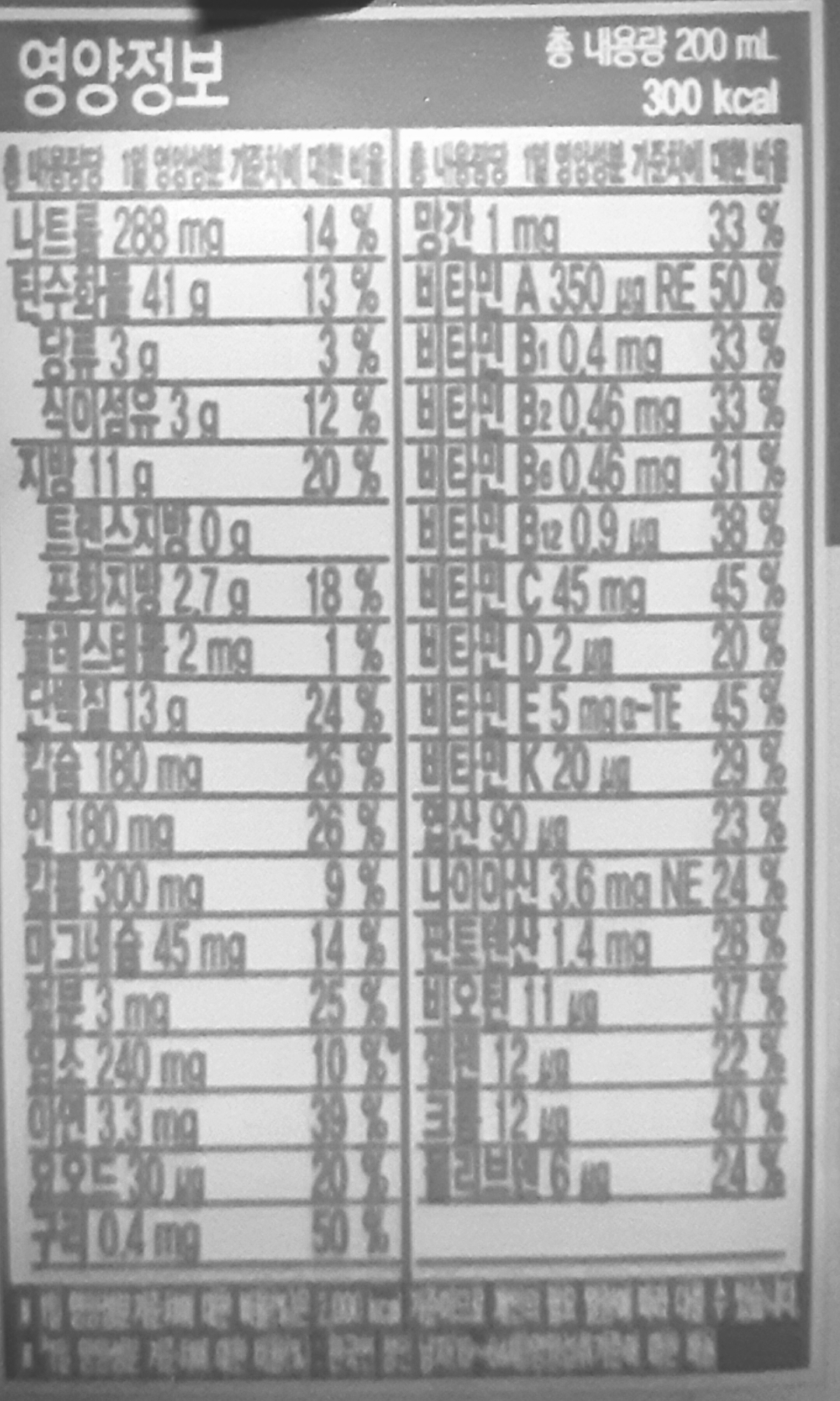 열량입니다. 여기서부터는 읽기 쉽게, 사진을 흑백으로 처리했습니다.