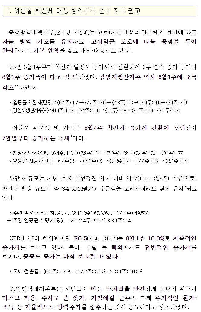 | 코로나19(2023.8.2) 질병관리청 보도자료: 실내마스크 착용 등 일상방역수칙 생활화 등 (0) | 2023.08.09 |