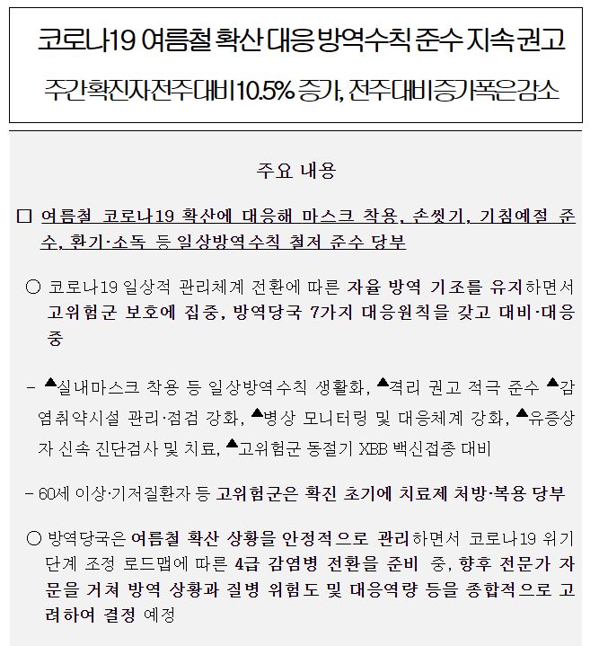 | 코로나19(2023.8.2) 질병관리청 보도자료: 실내마스크 착용 등 일상방역수칙 생활화 등 (0) | 2023.08.09 |