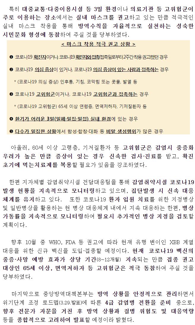 질병관리청, 실내마스크 착용 권고 등 (2023.8.9.) 본문