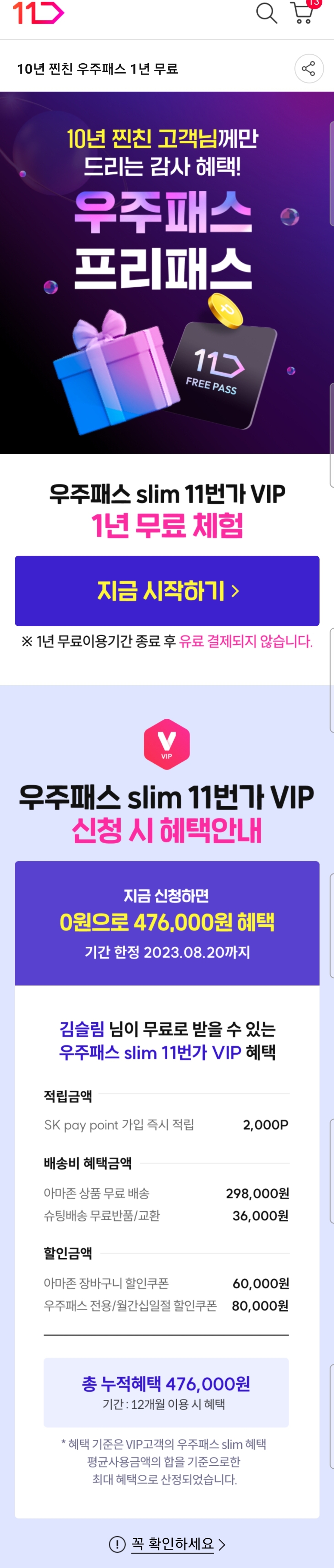 11번가, «10년 찐친 우주패스 1년 무료» 가입관련 기록 본문