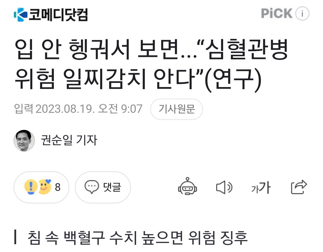 "건강한 성인의 침에서 잇몸 염증의 지표인 백혈구 수치가 심혈관병의 경고 신호이자 동맥 건강이 좋지 않다는 초기 지표"(......)