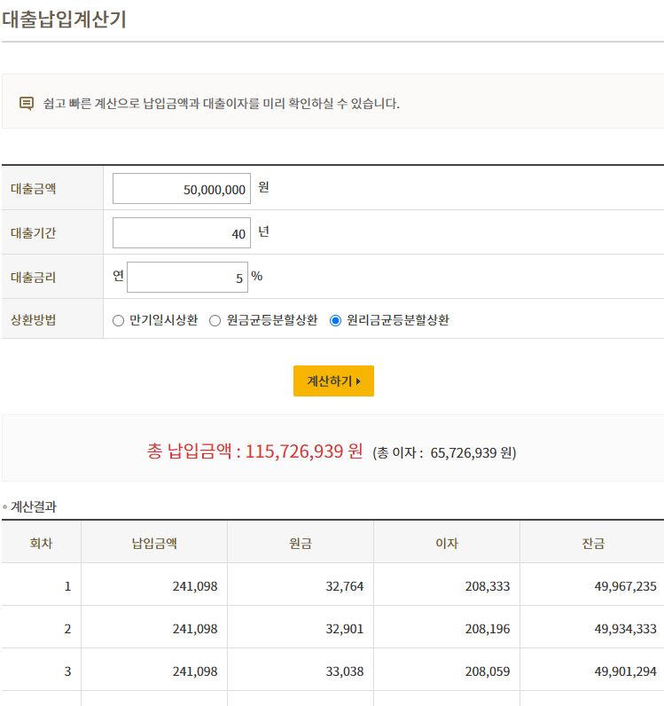 예를 들어, 5천만원을 연리 5%로 대출받아 40년간 갚는다고 가정하면,
