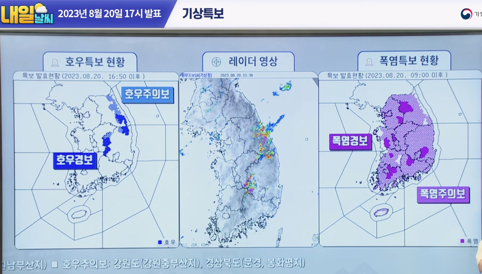 경북 및 강원산간지역 호우경보와 호우주의보.