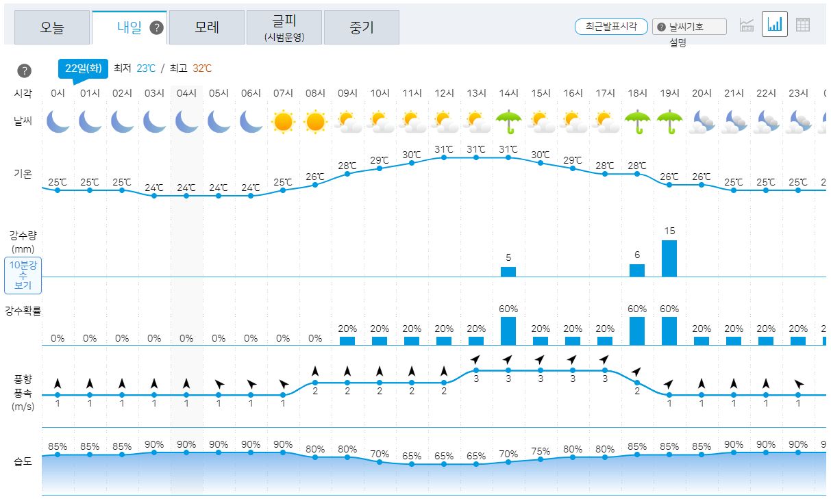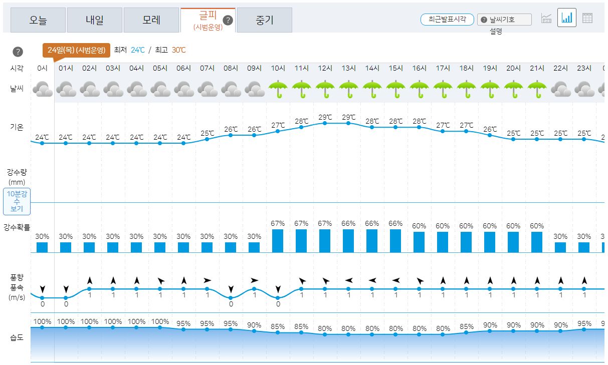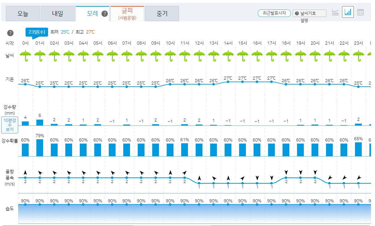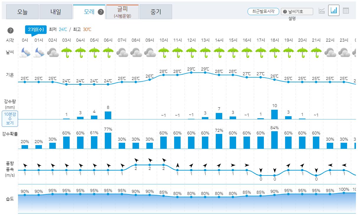 | 2023.8.24. 오늘 날씨: 기상청 일기예보: 비 + 습한 날씨로 낮에는 덥고 밤에는 열대야 (0) | 2023.08.24 |