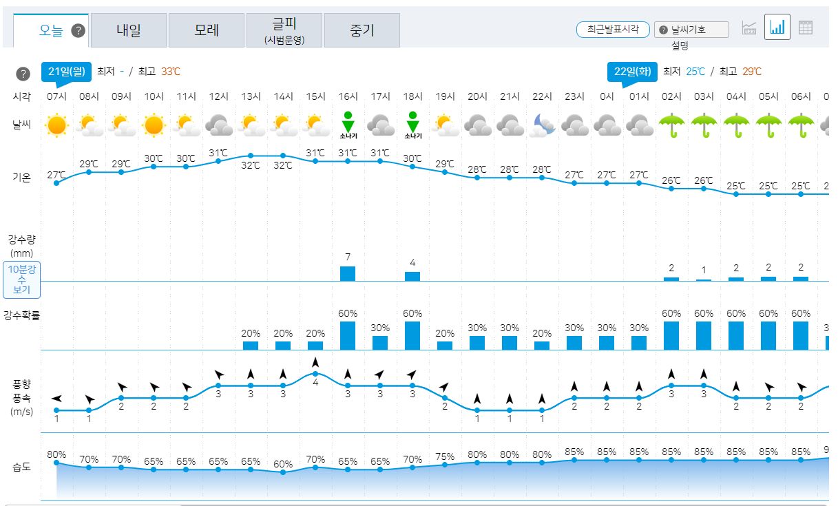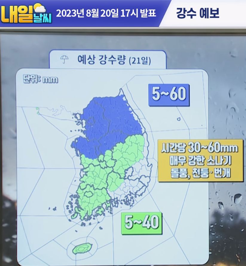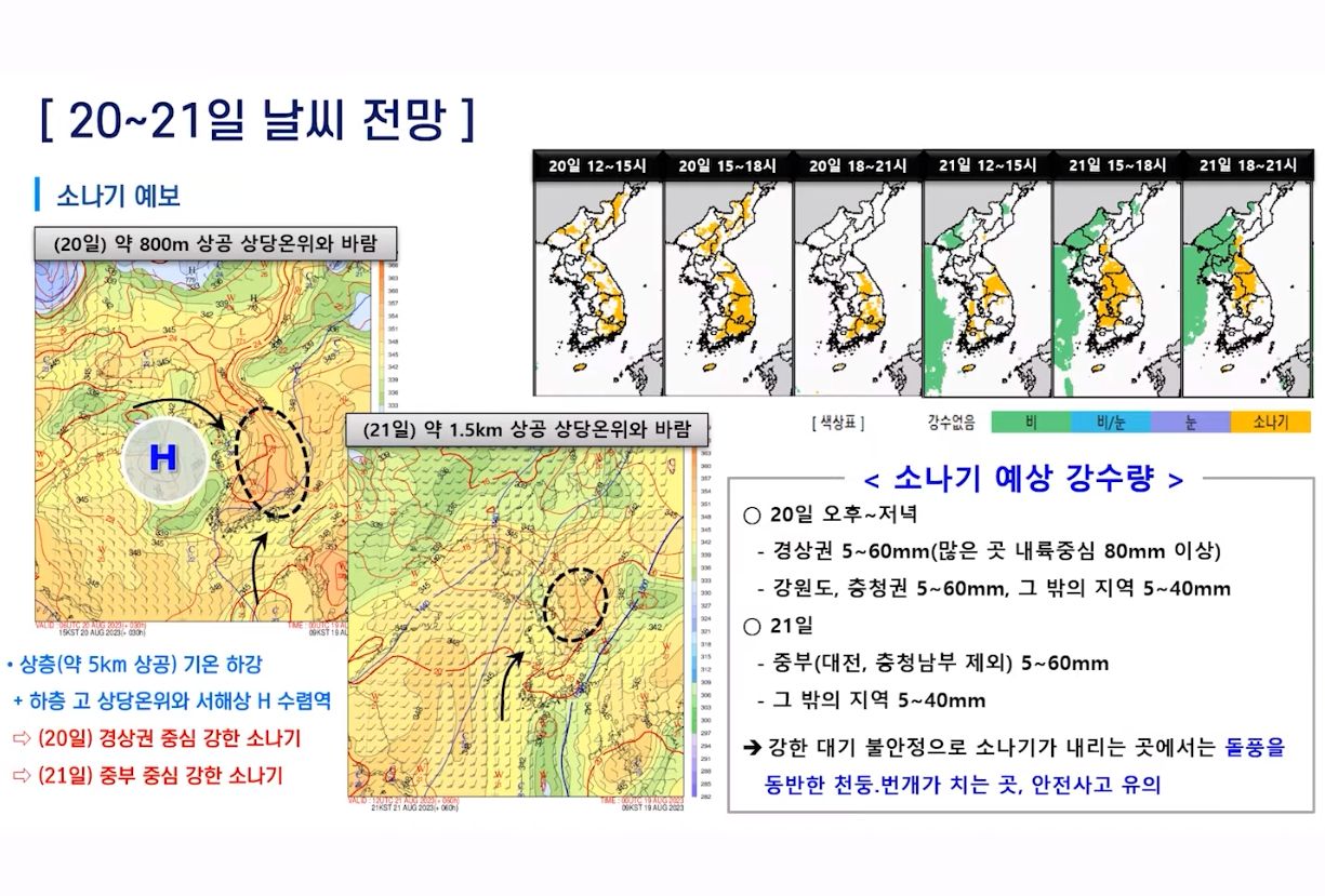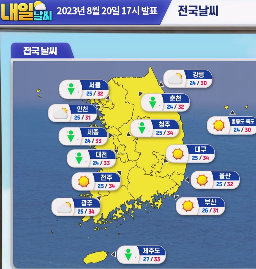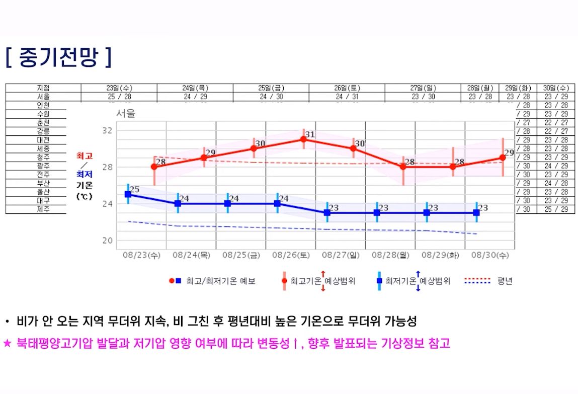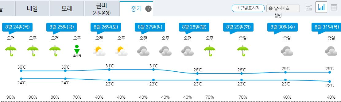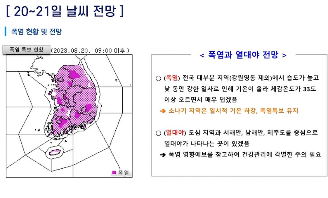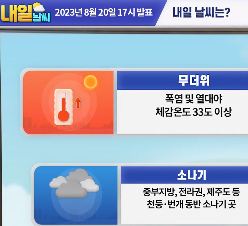 2023.8.21.월. ~8.30.수. 일기예보(기상청): 이번주내내 소나기오는 날씨 + 고온다습: 폭염 + 열대야 본문
