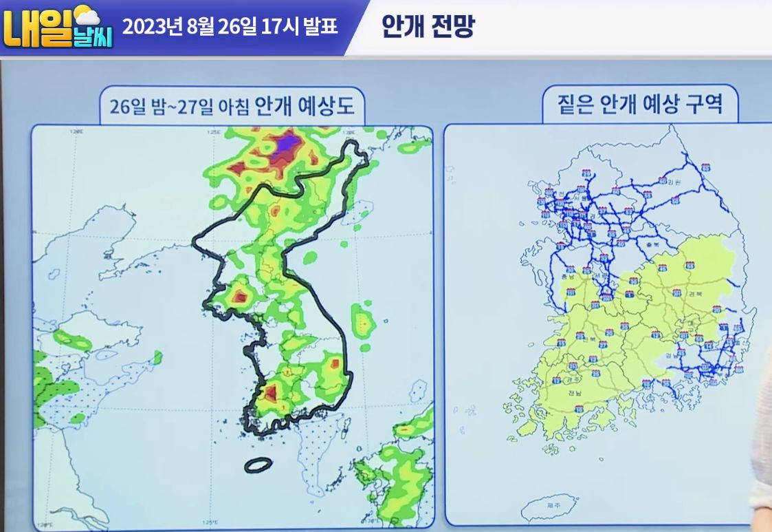 [내일날씨] 내일 남부지방 중심 새벽~아침 짙은 안개, 가끔 비. 8월 26일 17시 기준