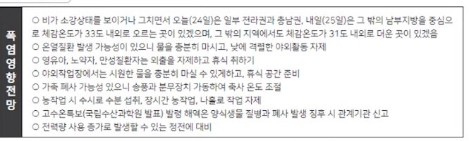 | 2023.8.24. 오늘 날씨: 기상청 일기예보: 비 + 습한 날씨로 낮에는 덥고 밤에는 열대야 (0) | 2023.08.24 |