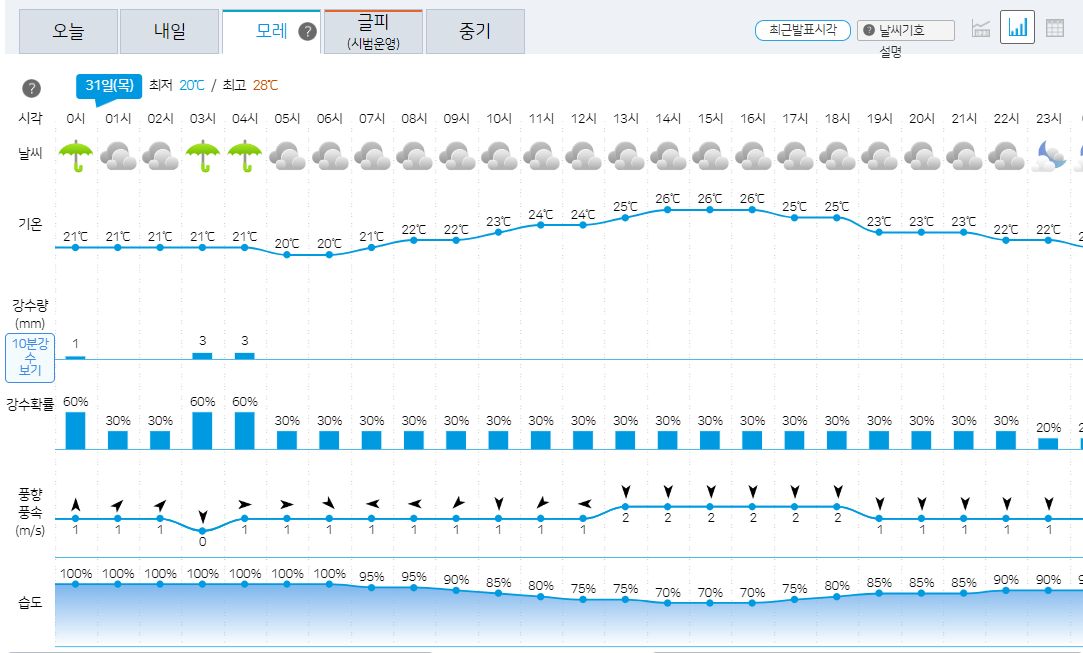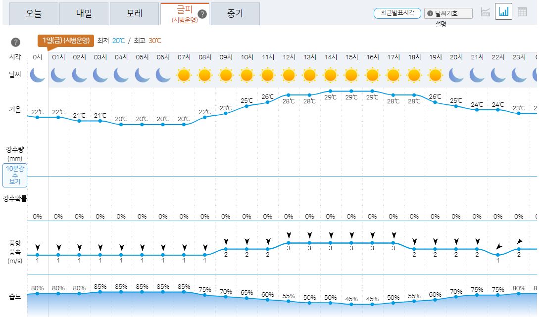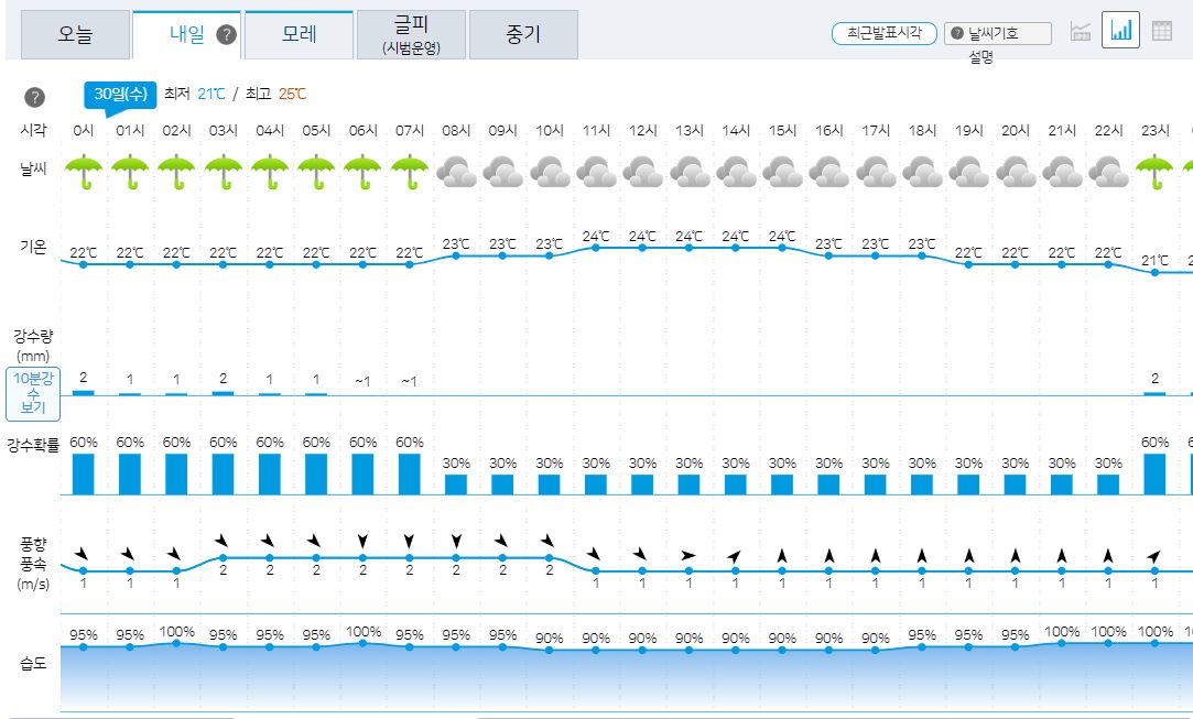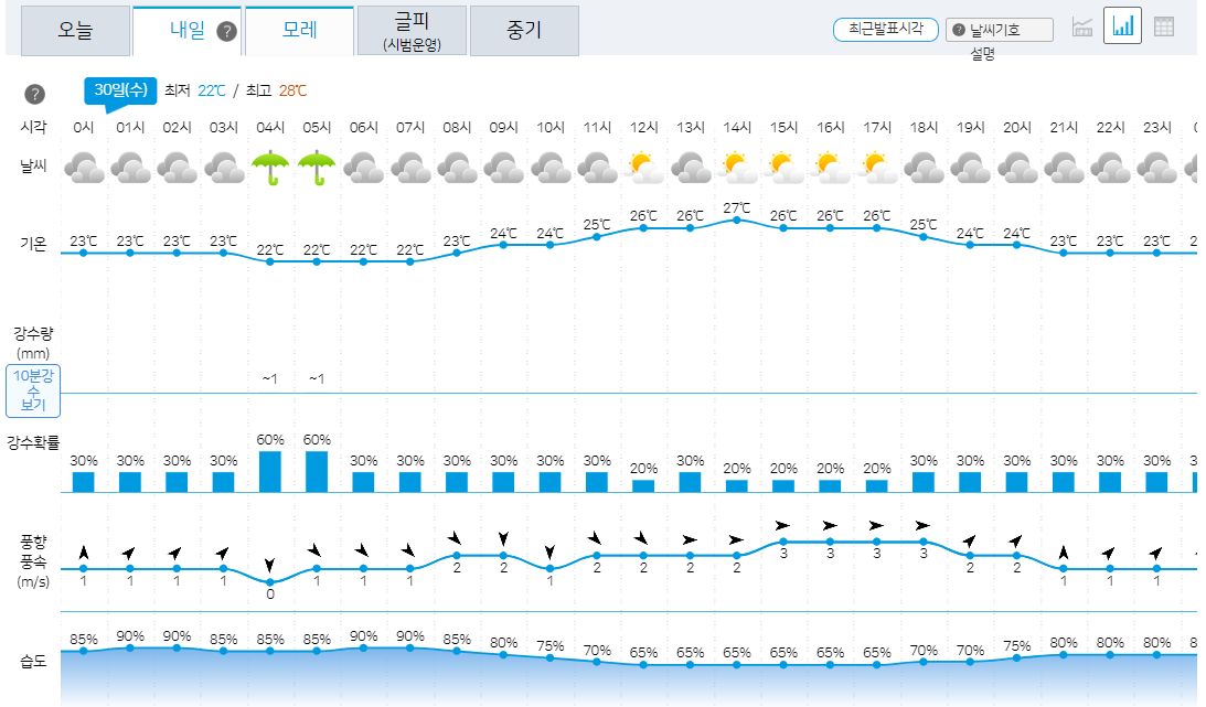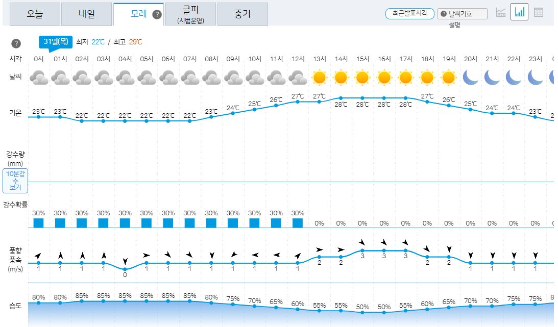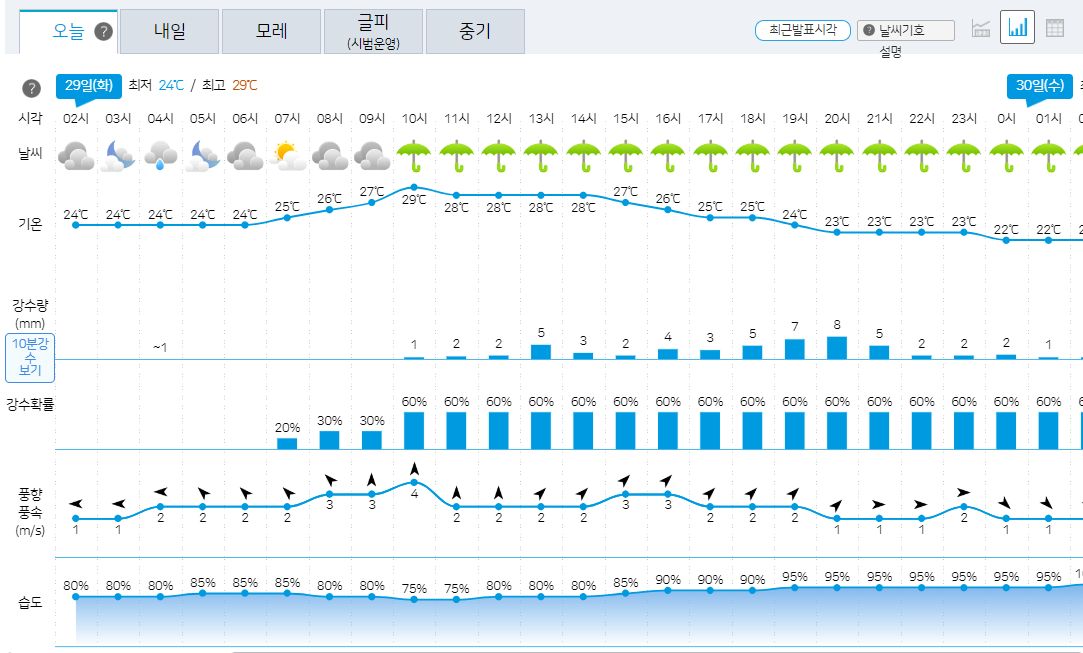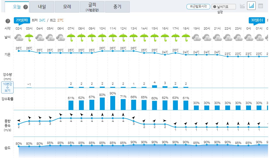 29일 화요일 날씨는 당일 오전에 새로 발표됩니다.