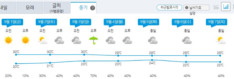 | 2023.8.30.수.~ 9.8.금. 일기예보, 태풍예보 (기상청): 30일 수요일, 서울은 지나가는 비 가능성, 대전은 보슬비가 하루종일. (0) | 2023.08.29 |