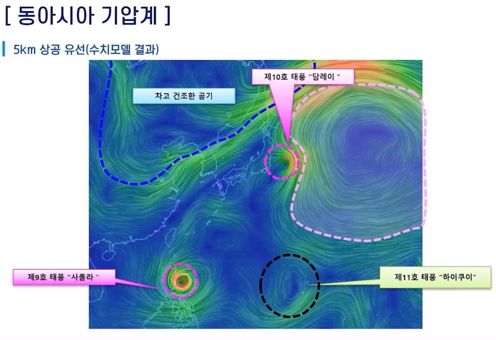 태풍은 우리나라에 바로 영향주는 것은 없지만, 3개나 있어서 날씨를 변화무쌍하게 만들고 있다네요. 한편 이런 큰 선풍기가 3개나 돌아다니니 그나마 날싸가 덜 더운 게 아닌하가는 생각도 들고.
