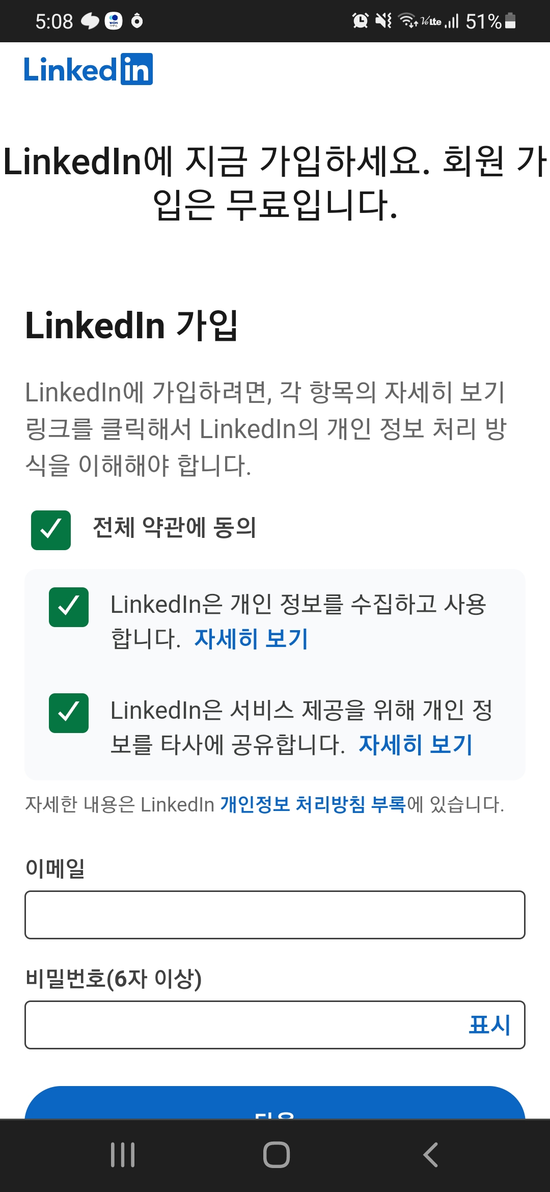 링크드인(LinkedIn)의 고의적으로 기능을 뺀 가입화면 본문